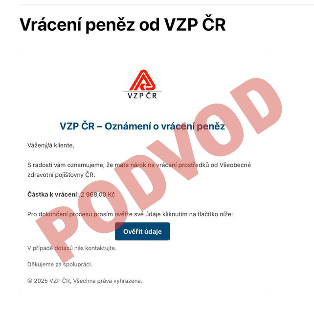 E-mail v příjemci vyvolává dojem, že komunikuje přímo s VZP ČR a že se mu vyplatí poskytnout požadované údaje. Ve skutečnosti se ale jedná o podvod, jehož cílem je dostat se přímo do bankovního účtu a následně připravit oběť o úspory.